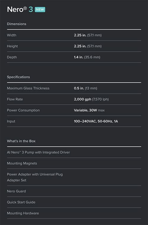 Nero 3 di Aqua Illumination crea un flusso ampio, regolabile, forte ma delicato allo stesso tempo. Le pompe tradizionali producono un movimento intenso che può infastidire i coralli, il design innovativo di Nero 3, invece, spinge l’acqua con un flusso ampio che può muovere alimenti, detriti o altre particelle libere galleggianti senza ​colpire i coralli direttamente. Le pompe di movimento, in un acquario marino, hanno diverse funzioni, l’obiettivo principale è quello di produrre un flusso che eviti ​la formazione di zone morte e contribuisca a smuovere i detriti che verranno poi rimossi dalla filtrazione. Con la tecnologia BlueTooth LE è possibile impostare la pompa in diverse modalità oppure creare un programma giornaliero per cambiare il flusso durante la giornata.