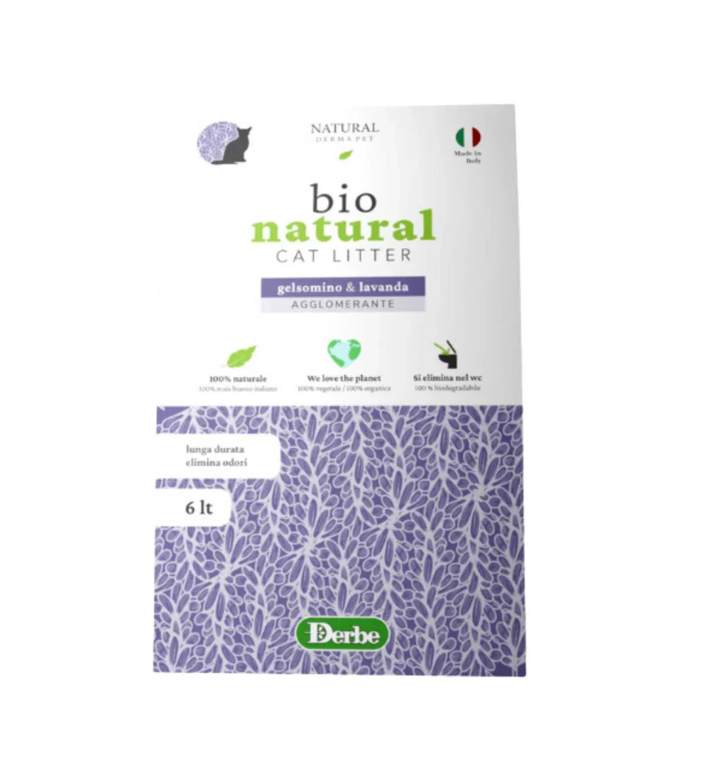 Derbe lettiera Natural Derma Pet Gelsomino e Lavanda รจ una lettiera agglomerante innovativa e naturale prodotta esclusivamente con granella di mais nazionale.