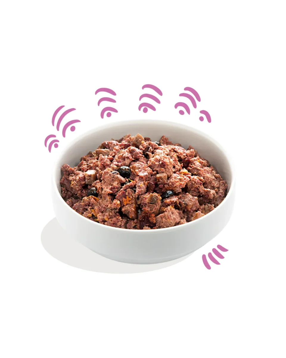 Questa ricetta senza cereali è realizzata con due fonti innovative di proteine che la rendono particolarmente adatta per i cani dallo stomaco sensibile: selvaggina (ricca di Omega-3) e anatra. I prebiotici in essa contenuti favoriscono inoltre un intestino sano. Carne e pesce sono arricchiti da frattaglie nutrienti (come il cuore o il fegato) e da un sano mix di frutta, verdura, erbe ed estratti vegetali. Cuciniamo il tutto a basse temperature per conservarne il gusto e le proprietà nutritive.