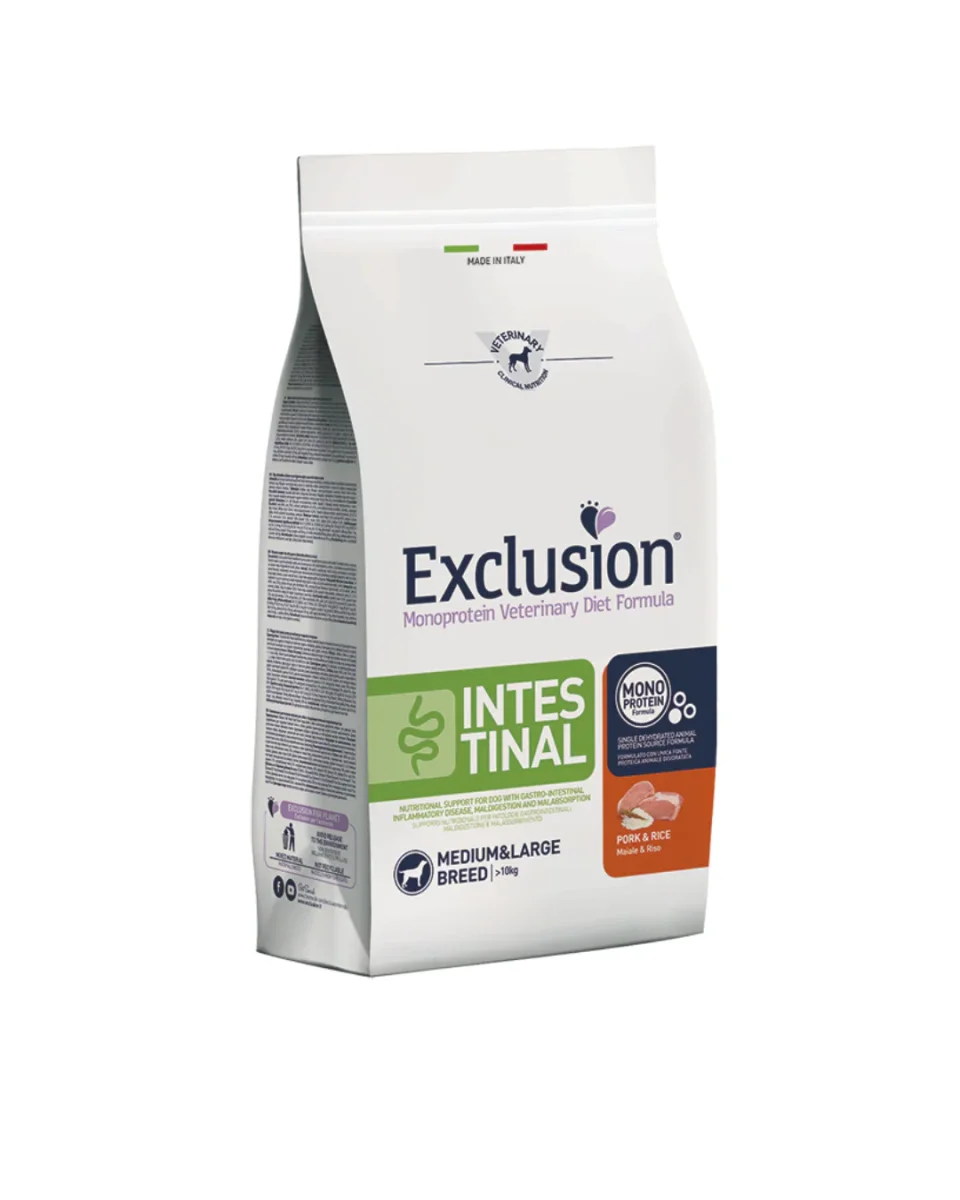Exclusion Monoprotein Veterinary Diet Formula Intestinal è un alimento dietetico con formulazione monoproteica, realizzato con un’unica fonte alternativa di proteine animali, ingredienti innovativi e preservato con tocoferoli naturali; rappresenta la risposta nutrizionale a disposizione del Veterinario, differenziata per taglia, come supporto nutrizionale per cani con patologie gastrointestinali, maldigestione e malassorbimento.