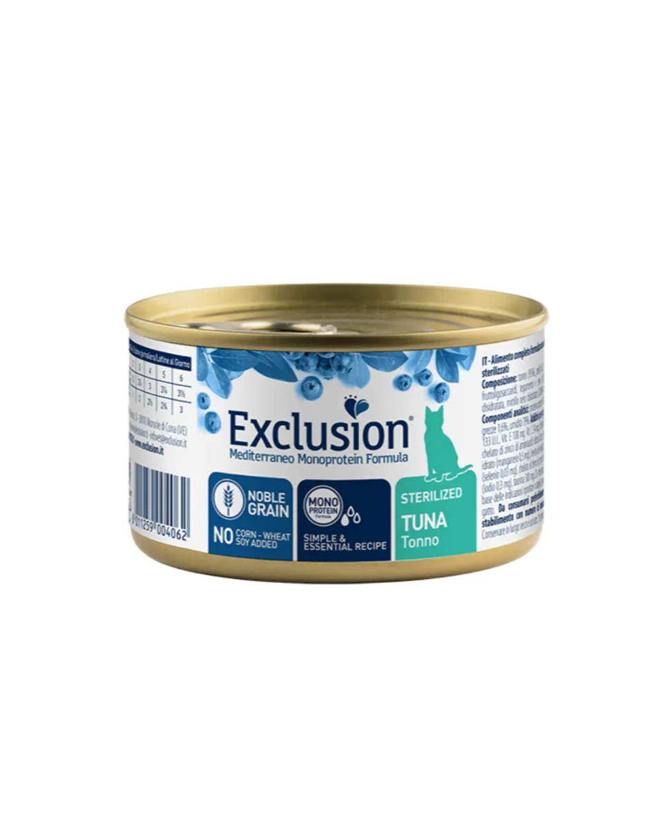 Exclusion Mediterraneo Cat Sterilizzato Noble Grain Monoproteico 85gr è un alimento completo, naturale e specificamente formulato per i gatti sterilizzati.