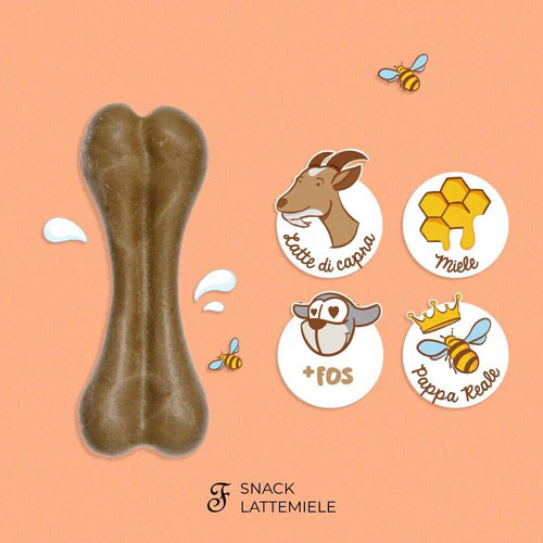 - Snack per cani a base di latte di capra, miele e fruttoligosaccaridi;