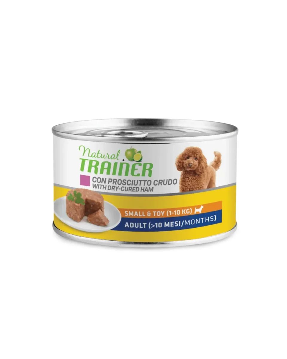 Natural Trainer Adult Small & Toy con Prosciutto Crudo è un alimento umido completo e bilanciato, formulato per soddisfare le esigenze nutrizionali dei cani adulti di piccola taglia.
