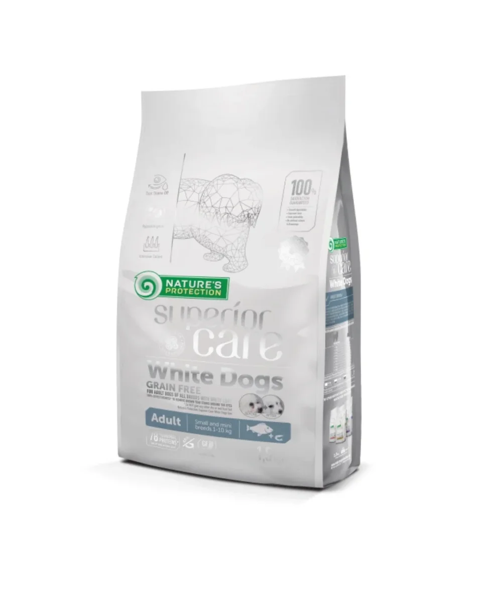 Nature’s Protection Superior Care White Dogs White Fish Adult Small and Mini Breeds è più di un semplice alimento. È un sistema di salute quotidiano appositamente studiato per cani di piccola e piccolissima taglia dal manto chiaro, inclini alle allergie: dalla pelle sensibile alla digestione, fino alle macchie lacrimali.