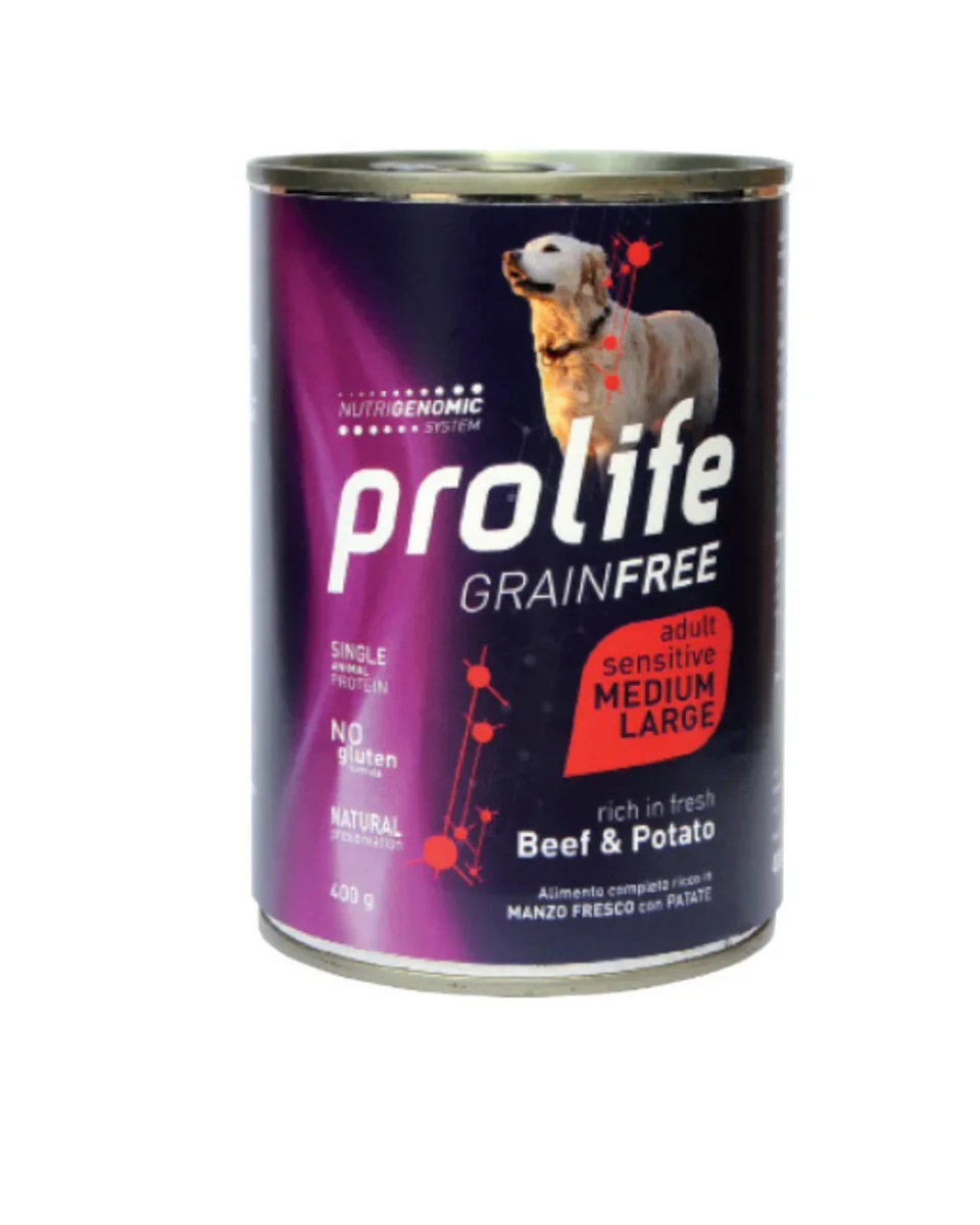 Prolife – Grain Free Sensitive – Dog Adult Medium / Large – Manzo e Patate – Umido in Lattina 400 gr