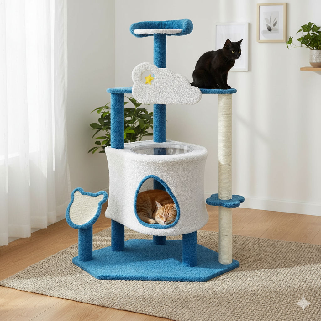 Scopri “NuageBleu”, un tiragraffi dal design ispirato alle nuvole e al cielo blu, perfetto per offrire al tuo gatto uno spazio dove giocare, riposare e graffiare. Con i suoi diversi livelli, la sua accogliente casetta e i suoi pali per graffiare, questo tiragraffi soddisfa tutte le esigenze del tuo gatto aggiungendo un tocco di magia alla tua casa.